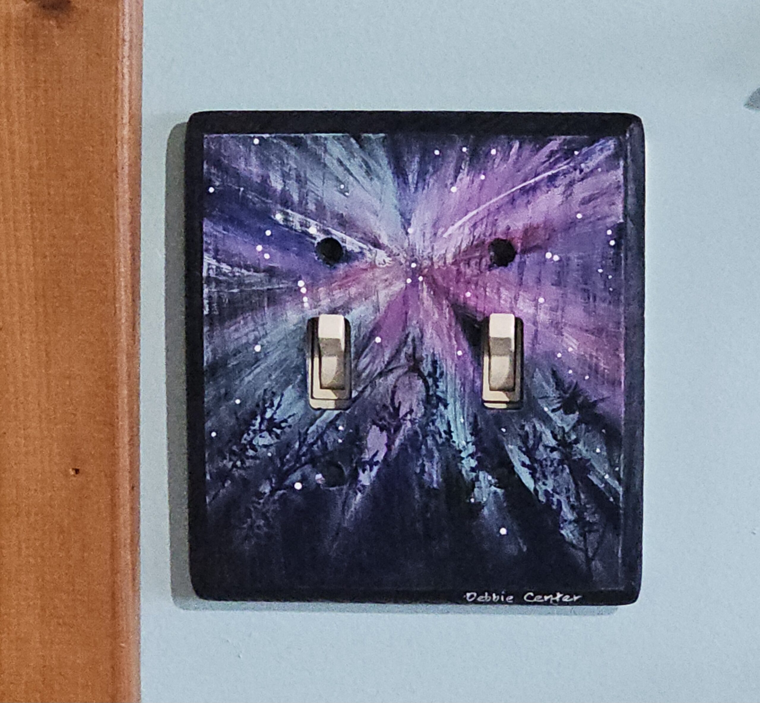 A wooden, double light switch plate cover, hand painted by Debbie Center. Orion, Taurus, and a shooting star with northern lights over a forest.